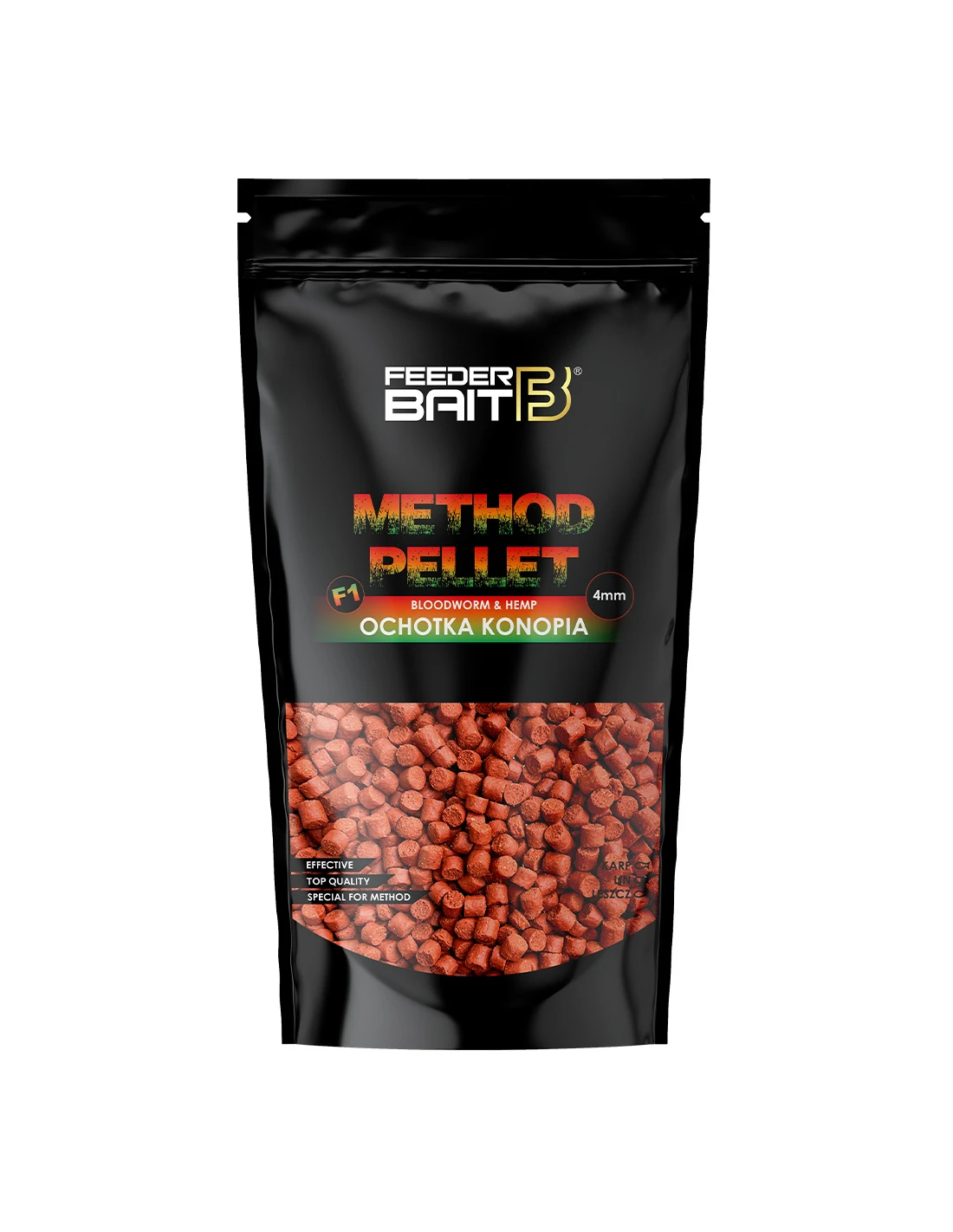Nelle pellets è stata utilizzata la tecnologia a rilascio lento. La struttura del pellet è stata progettata in modo che si disgregasse a strati, rilasciando costantemente l'aroma. Si è dimostrato ottimo per attirare pesci di grandi dimensioni e mantenerli nell'area di pesca. Meglio se usato in combinazione con l'Attrattore F1 Ochotka Konopia.